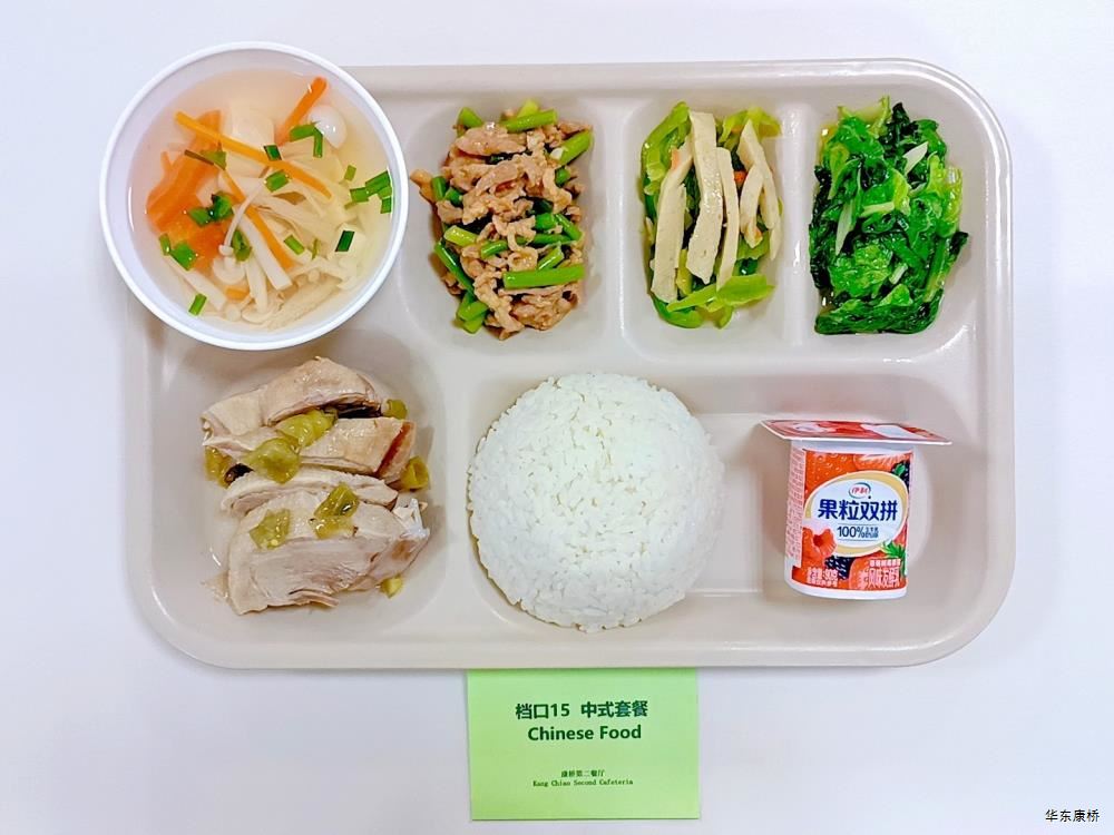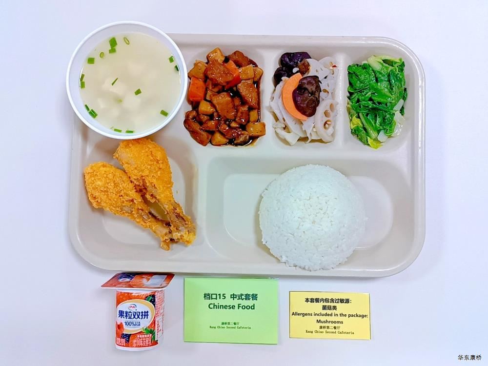 "香炸鸡腿Fried chicken leg,黑椒杏鲍菇鸭仔粒(过敏源)Fried diced duck with black pepper and pleurotus eryngii(Allergy source),酸辣藕片(微辣)Hot and sour lotus root slices (Slightly spicy) ,有机蔬菜Organic vegetables,主食:白米饭Rice ,酸奶/水果Yogurt or Fruit,鱼头豆腐汤(过敏源)Fish head tofu soup(Allergy source)