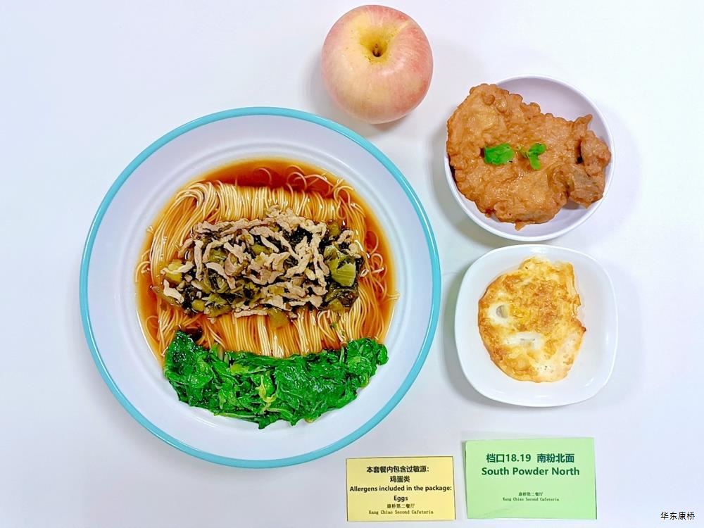 红烧大排面Braised pork chop noodles,酸菜肉丝Shredded pork with chinese sauerkraut,煎蛋(过敏源)Fried egg(Allergy source),有机时蔬一道Organic vegetable ,酸奶/水果Yogurt or Fruit