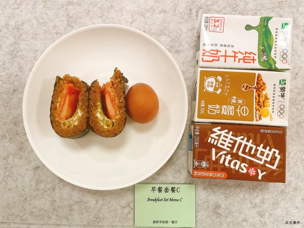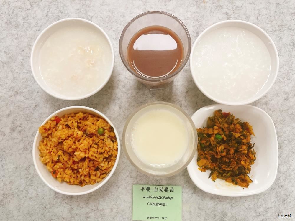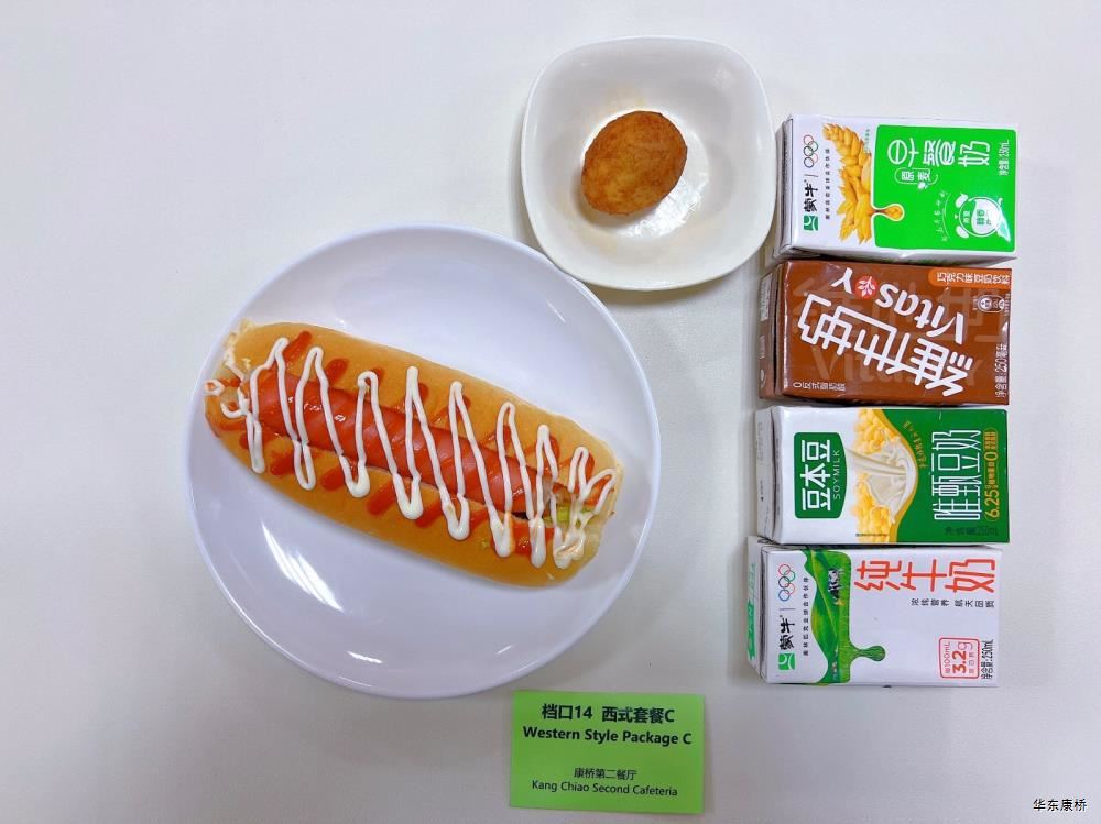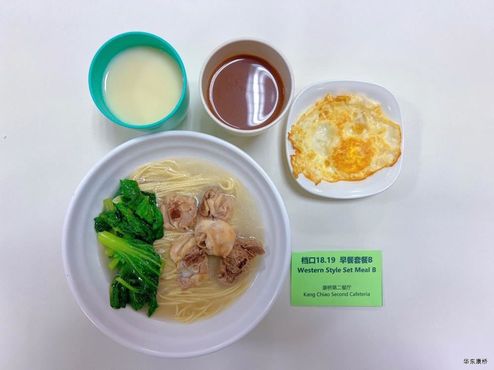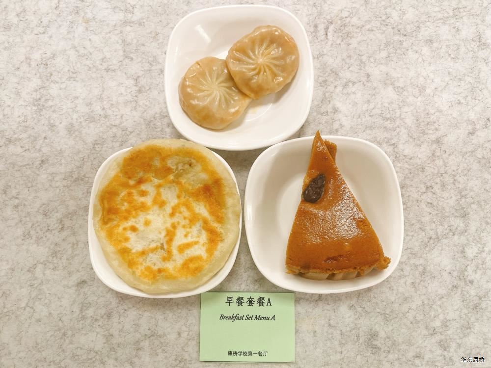 "鲜肉生煎包*2Fresh meat pan-fried bun/糯米烧麦Glutinous rice shao-mai/香酥油条Crispy youtiao(三选二) " 经典美式热狗(140g)American hot dog,虎皮蛋Tiger skin egg,纯牛奶/豆奶/早餐奶/酸牛奶(四选一)Milk/Soymilk/Breakfast milk//Sour milk 千层牛肉饼Multi-layered beef cake,虎皮蛋Tiger skin egg,纯牛奶/豆奶/早餐奶/酸牛奶(四选一)Pure milk / soy milk / breakfast milk / yogurt "蒸南瓜Steamed pumpkin,牛肉蛋花粥Beef and egg drop porridge,豆浆/阿华田Soybean milk / Ahua Tian,白粥 Rice Congee,酸脆黄瓜Sour crisp cucumber,红油萝卜丁Diced radish with red oil,蛋炒饭Fried rice with egg " 鸡汤面Chicken soup noodles,荷包蛋Fried egg,清炒时蔬Organic vegetables,豆浆/阿华田Soybean milk / Ahua Tian "白煮蛋Boiled egg/小葱炒蛋Stir fried eggs with scallions(二选一) "