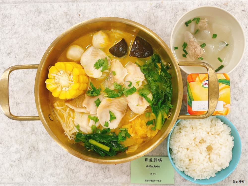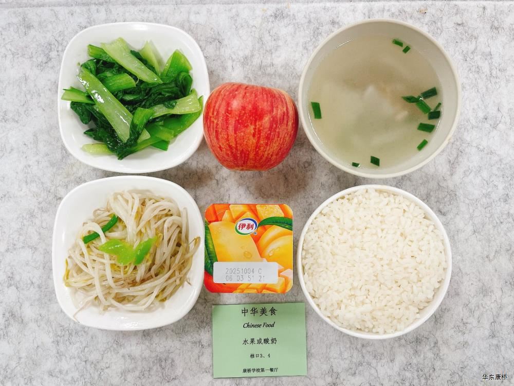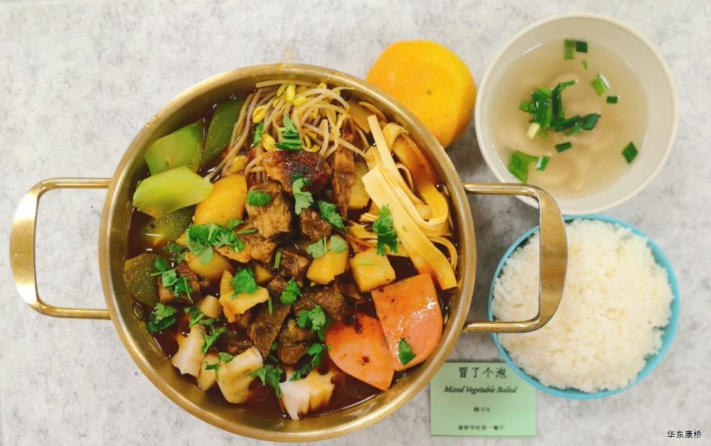 麻辣牛腩土豆煲(微辣) Spicy Beef Brisket with Potato Claypot 牛腩,千张,豆芽,莴笋、土豆,火腿,莲藕 Beef Brisket,Skin of tofu,Bean Curd,Lettuce,Potato,Ham,Louis Root 有机时蔬(1款) Fried Vegetable 菌菇肉片汤 Sliced Pork and Mushroom Soup 水果或酸奶 Fruit or Yogurt 苹果烧鸡扒配墨西哥番茄酱 Apple Braised Chicken Cutlets and Mexican Tomato Sauce 茄汁蝴蝶面 西葫芦/胡萝卜 zucchini, Carrot 葡式蛋挞 Egg Tart 橙汁 Orange Juice 水果或酸奶 Fruit or Yogurt 大荤(四选一) 咸蛋黄狮子头 Braised Salt Egg with Pork Ball 牛腩炖土豆 Stewed Potato with Beef Brisket 黄飞鸿鸭块 Deep-fried Duck with Chili Spice 糖醋排条 Sweet and Sour Pork Strips 小荤(四选一) 千叶鸡片 Wok-fried Chicken Sliced with Bean Curd 水煮肉片 Boiled Pork Sliced with Chili Sauce 芹菜鸡丝 Fried Chicken Shredded with Celery 莴笋香干肉片 Fried Pork Sliced with Bean Curd and Lettuce 酸辣炒白菜 Hot and Sour Cabbage 有机时蔬(1款) Fried Vegetable 菌菇肉片汤 Sliced Pork and Mushroom Soup 水果或酸奶 Fruit or Yogurt 蔬菜炒饭 Vegetable Fried Rice 什菌扒豆腐 Braised Dofu with Assorted Mushroom 蒜苔素腰片 Fried Vegetarian Sliced with Chive 酸辣炒白菜 Hot and Sour Cabbage 有机时蔬(1款) Fried Vegetable 雪梨银耳羹 White Fungus and Pear Soup 水果或酸奶 Fruit or Yogurt 泰式滑蛋牛肉炒粉丝 Thai Style Fried Beef and Egg Vermicelli 拇指生煎(16个) Thumb-Sized Pan-Fried Buns 酸辣炒白菜 Hot and Sour Cabbage 有机时蔬(1款) Fried Vegetable 菌菇肉片汤Sliced Pork and Mushroom Soup水果或酸奶Fruit or Yogurt 大骨猪肉米线 Spicy Hot Pot with Pork Bone 江西米粉,蟹肉棒,海带丝,蟹味菇 Rice Noodle,Crab Stick,Kelp,Crab Mushroom 酸辣炒白菜 Hot and Sour Cabbage 清炒时蔬(1款) Fried Vegetable 水果或酸奶 Fruit or Yogurt -