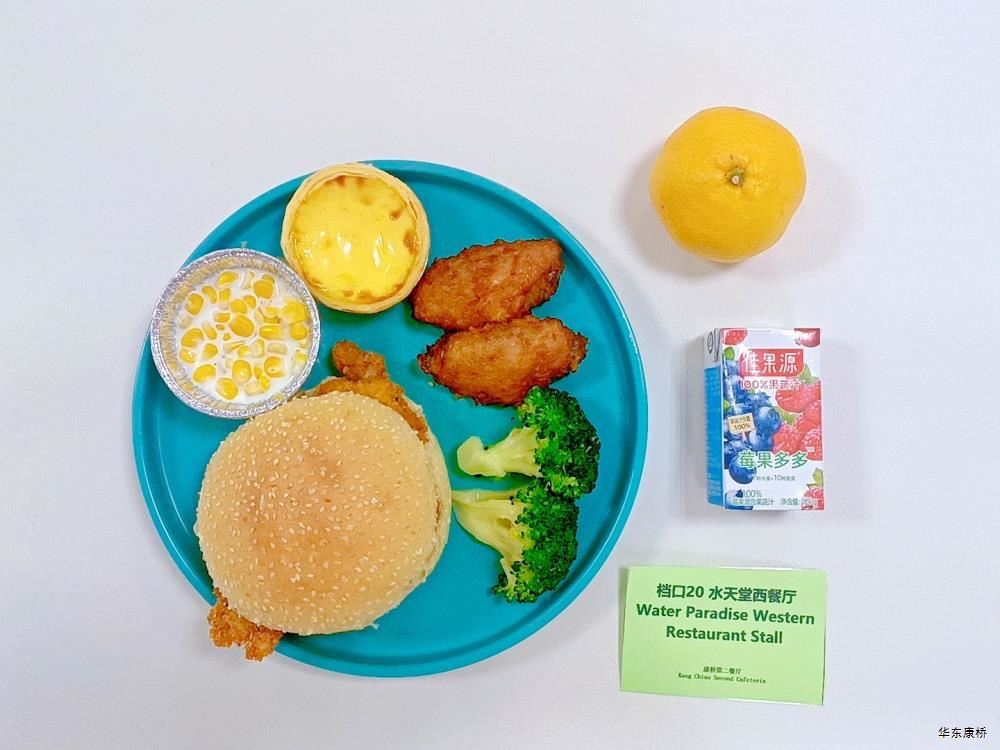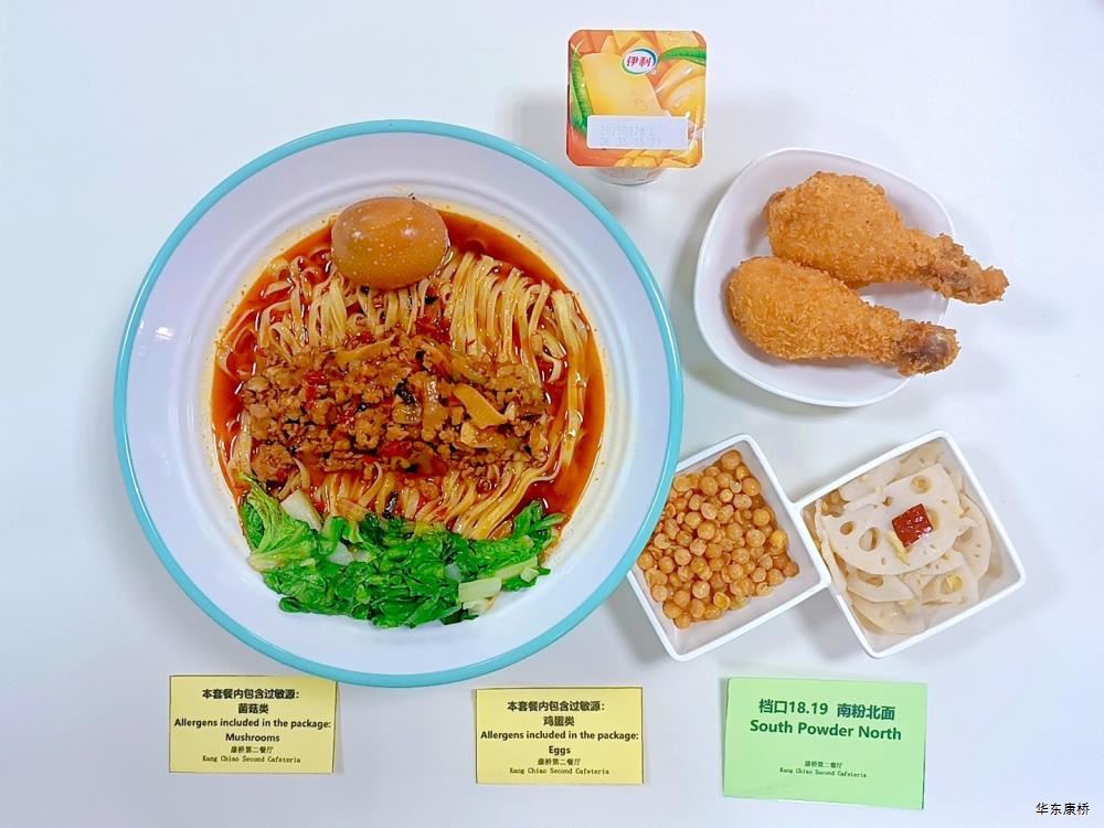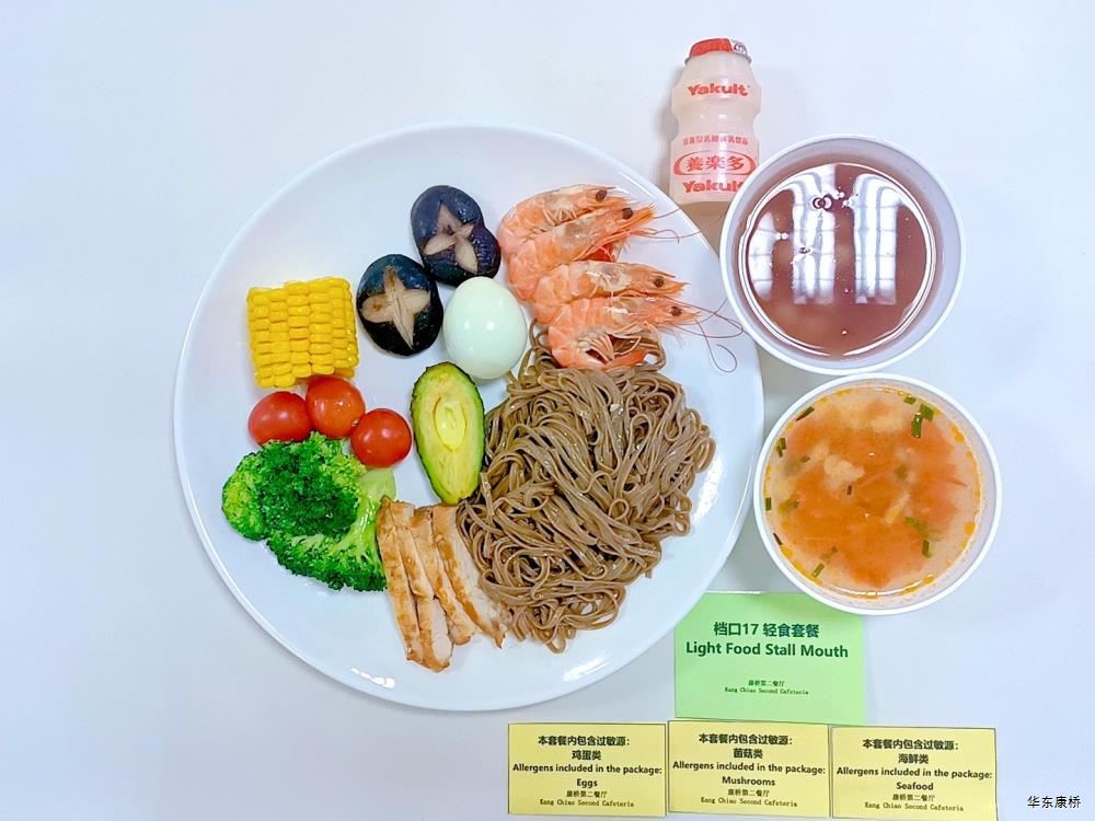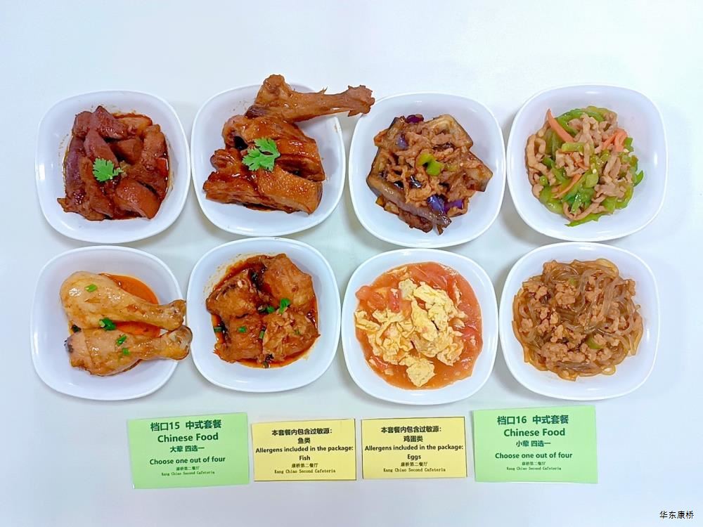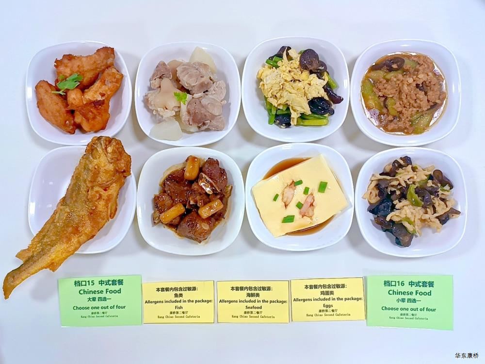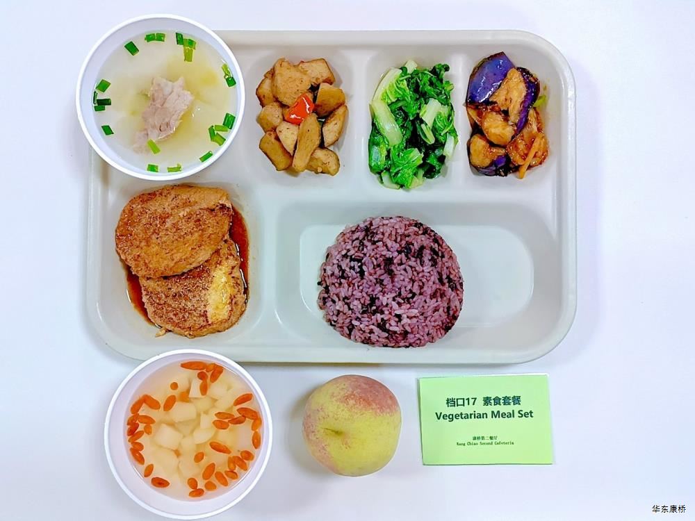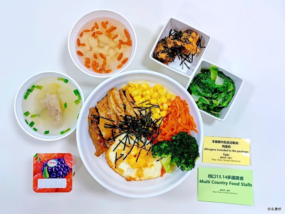 日式照烧鸡排饭(配料:鸡排、胡萝卜丝、西蓝花、玉米粒、海苔、日式照烧汁、煎蛋(过敏源))Roasted chicken paifan(Ingredients: chicken chops、 shredded carrots、 broccoli、 corn kernels、 seaweed、 roasted sauce、 fried eggs (Allergy source)),章鱼烧*2Takoyaki,有机蔬菜一道 Organic vegetables,酸奶/水果Yogurt or Fruit,冬瓜排骨汤Winter melon pork ribs soup,山药枸杞汤Yam wolfberry soup 大荤(4选1)糖醋仔排Sweet and Sour Spare Ribs/奥尔良烤翅Orlean roasted wings/红烧小黄鱼(带刺、过敏源)Braised small yellow croaker(With thorns、 over sensitive source)/萝卜炖猪蹄Stewed trotters with radish,小荤(4选1)蒜苔炒鸡蛋(过敏源)Garlic sprouts and scrambled eggs(Allergy source)/肉沫丝瓜Minced pork with loofah/木耳鸡丝Shredded chicken with fungus/虾仁炖蛋(过敏源)Steamed shrimp and egg(Allergy source), 蔬菜:地三鲜Sautéed Potato、 Green Pepper and Eggplant,有机蔬菜Organic vegetables,主食:白米饭Rice,酸奶/水果 Yogurt or Fruit,冬瓜排骨汤Winter melon pork ribs soup,山药枸杞汤Yam wolfberry soup 重庆小面(微辣)Chongqing noodles(Slightly spicy),香炸鸡腿Fried chicken leg,卤蛋(过敏源)Spiced corned egg (Allergy source),黄金豆Fried peas,姜汁藕片Lotus root slices with ginger sauce,有机蔬菜一道 Organic vegetables ,酸奶/水果Yogurt or Fruit 藤椒风味猪排汉堡Tengjiaofeng pork chop hamburger,奥尔良烤鸡翅*2Aoerliang roast chicken wings,葡式蛋挞*1Portuguese egg tart ,西蓝花Broccoli,奶香玉米粒Milk-flavored corn kernels,特殊饮品Special drink,酸奶/水果Yogurt or Fruit 五香素鸡Spiced tofu,地三鲜Sautéed Potato、 Green Pepper and Eggplant,孜然面筋Cumin gluten ,有机蔬菜一道Organic vegetables ,紫米饭Purple rice,酸奶/水果Fruit or Yogurt,冬瓜排骨汤Winter melon pork ribs soup,山药枸杞汤Yam wolfberry soup -