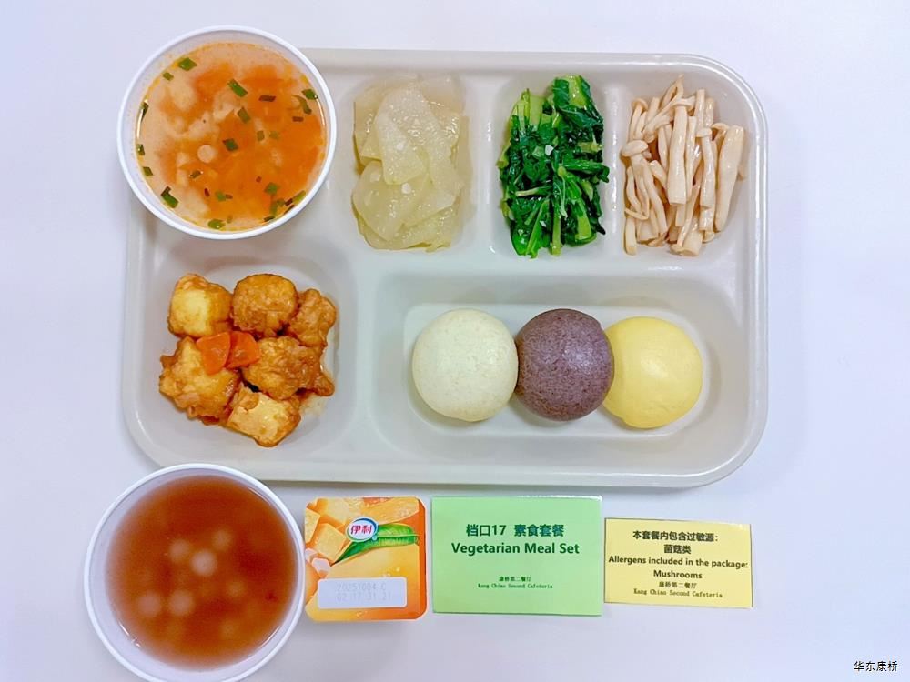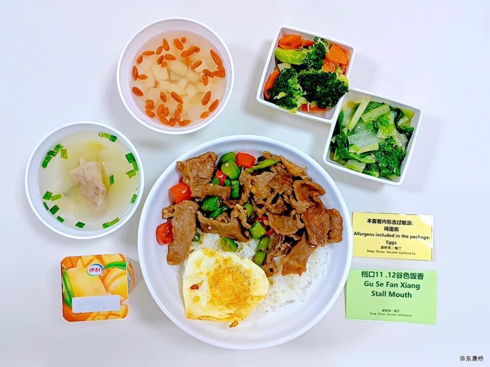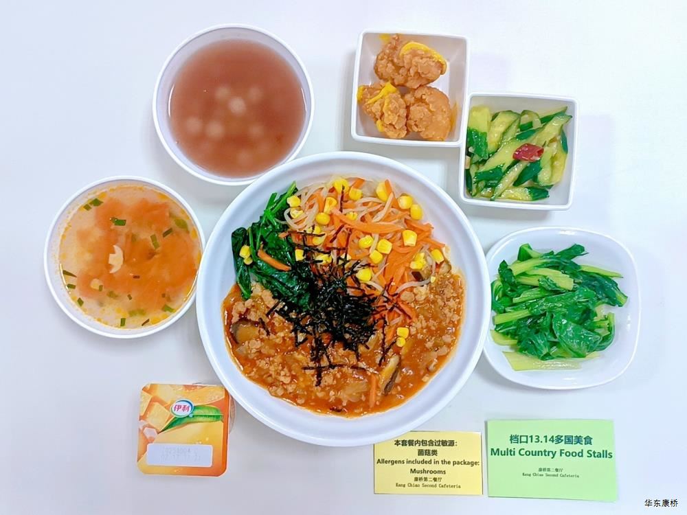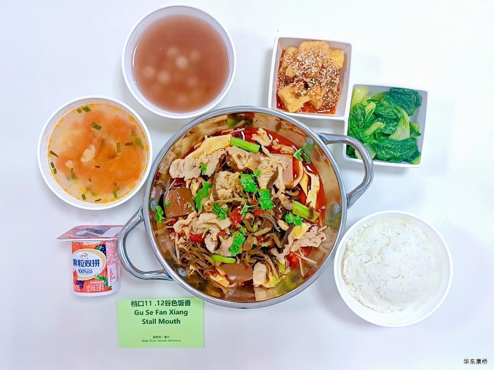 "川湘毛血旺(微辣)(配料:毛肚、鸭血、霞糕、方腿、精肉片、黄豆芽、百叶、大白菜、贡菜)Spicy meat and vegetables(slightly spicy)(Ingredients: beef omasum、 duck blood、 Xiagao、 ham、 lean meat slices、 bean sprouts、 bean curd skin、 Chinese cabbage、 tribute),铁板煎豆腐*4Fried tofu with iron plate,有机蔬菜一道Organic vegetables , 主食:白米饭Rice,酸奶/水果Yogurt or Fruit,番茄菌菇汤(过敏源)Tomato mushroom soup(Allergy source),豆沙小圆子Bean paste glutinous rice balls " 韩式肉酱拌饭Korean-style meat sauce rice dish,韩式炸鸡块Korean-style fried chicken pieces,蒜香黄瓜Garlic cucumber,有机蔬菜一道Organic vegetables , 酸奶/水果Yogurt or Fruit,番茄菌菇汤(过敏源)Tomato mushroom soup(Allergy source),豆沙小圆子Bean paste glutinous rice balls 大荤(4选1)红烧鸡腿Braised chicken leg/麻辣鱼块(微辣、带刺、过敏源)Fish fillet in chilli sauce(Slightly spicy、With thorns、 over sensitive source)/蜜汁小肉Small meat in honey sauce/酱板鸭Spicy salted duck,小荤(4选1)青椒炒肉丝(微辣)Fried shredded pork with green pepper(slightly spicy)/番茄炒蛋(过敏源)(咸)Scrambled eggs with tomatoes(Allergy source)(salty)/鱼香茄子Fried egg plant with ground pork/肉沫粉丝Pork foam vermicelli, 蔬菜:丝瓜毛豆Loofah soybean,有机蔬菜Organic vegetables,主食:白米饭Rice,酸奶/水果 Yogurt or Fruit,番茄菌菇汤(过敏源)Tomato mushroom soup(Allergy source),豆沙小圆子Bean paste glutinous rice balls 红烧玉子豆腐Braised tofu,葱油菌菇(过敏源)Scallion oil mushroom(Allergy source),鸡汁菜心Chicken juice green vegetables,清炒冬瓜Fried winter melon,窝窝头*3Steamed corn bread,酸奶/水果Yogurt or Fruit,番茄菌菇汤(过敏源)Tomato mushroom soup(Allergy source),豆沙小圆子Bean paste glutinous rice balls 黑椒海盐大虾+孜然鸡胸肉轻食(配料:大虾(过敏源)、鸡胸肉、荞麦面、玉米段、西蓝花、小番茄、香菇、牛油果、白煮蛋(过敏源))Prawn+chicken breast light food(Ingredients: prawns、 chicken breast、 buckwheat noodles、 corn segments、 broccoli、 tomatoes、 mushrooms、 avocados 、boiled egg(Allergy source)),特殊饮品Special drink,番茄菌菇汤(过敏源)Tomato mushroom soup(Allergy source),豆沙小圆子Bean paste glutinous rice balls 大盘鸡拌面Big plate chicken noodles,香煎里脊肉Pan-fried tenderloin,有机蔬菜一道 Organic vegetables,酸奶/水果Yogurt or Fruit 黑椒烤牛排Grilled steak with black pepper,黑椒肉酱意面spaghetti with black pepper sauce,法式炸薯角 French fried potatoes,胡萝卜Carrots ,西蓝花Broccoli,特殊饮品Special drink,酸奶/水果Yogurt or Fruit -