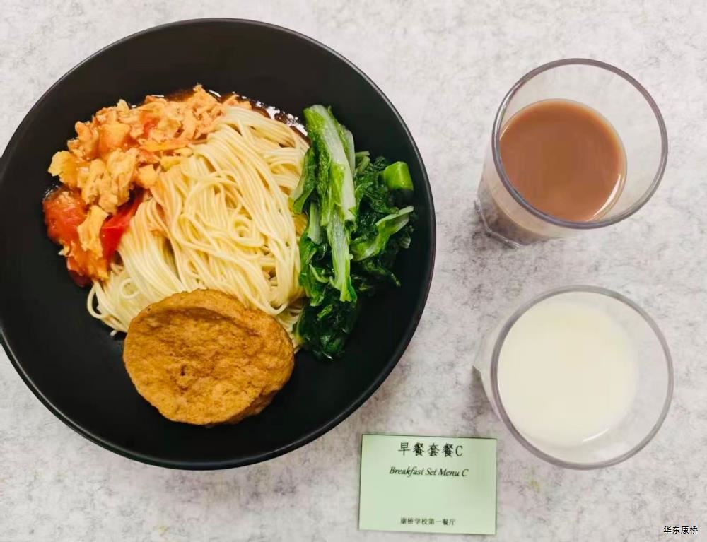 番茄鸡蛋面 Tomato and Egg Noodle Soup 卤素鸡 Bean Sprouts 绿叶菜 Fried Vegetable 豆浆/阿华田 Soybean Drink/Ovaltine