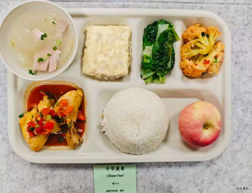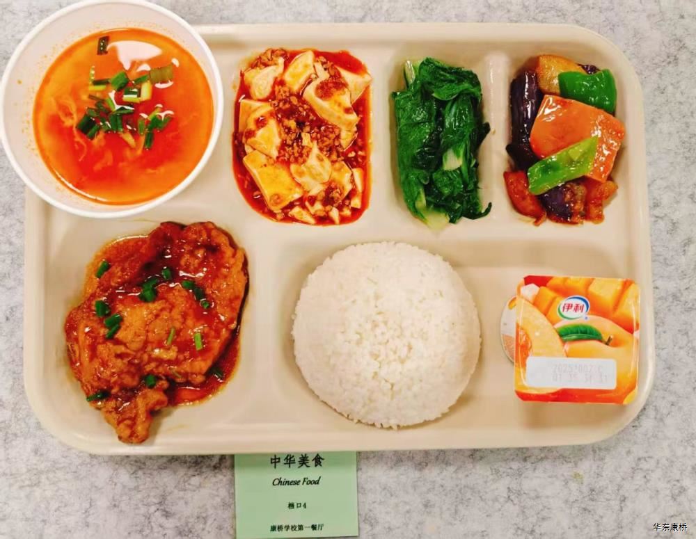 五香大排 SDeep-Fried Pork Ribs 麻婆豆腐 Mapo Tofu 地三鲜 Braised Eggplant and Potato with Pepper 绿叶菜(1款) Fried Vegetable 番茄鸡蛋汤 Tomato and Egg Soup 水果或酸奶 Fruit or Yogurt