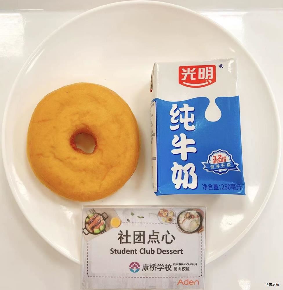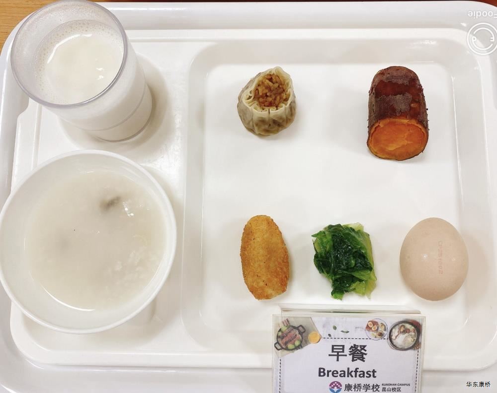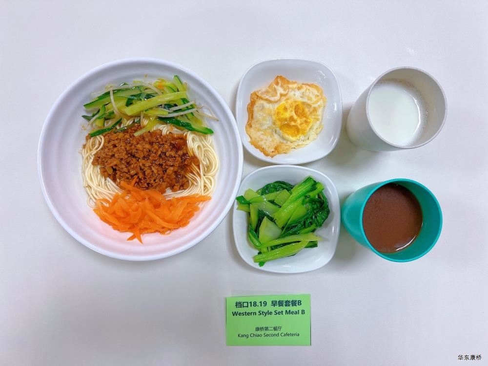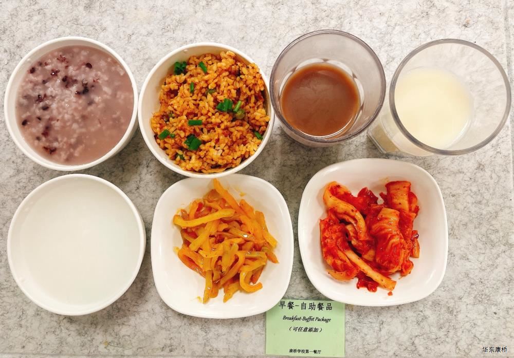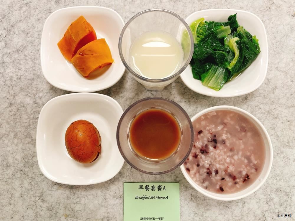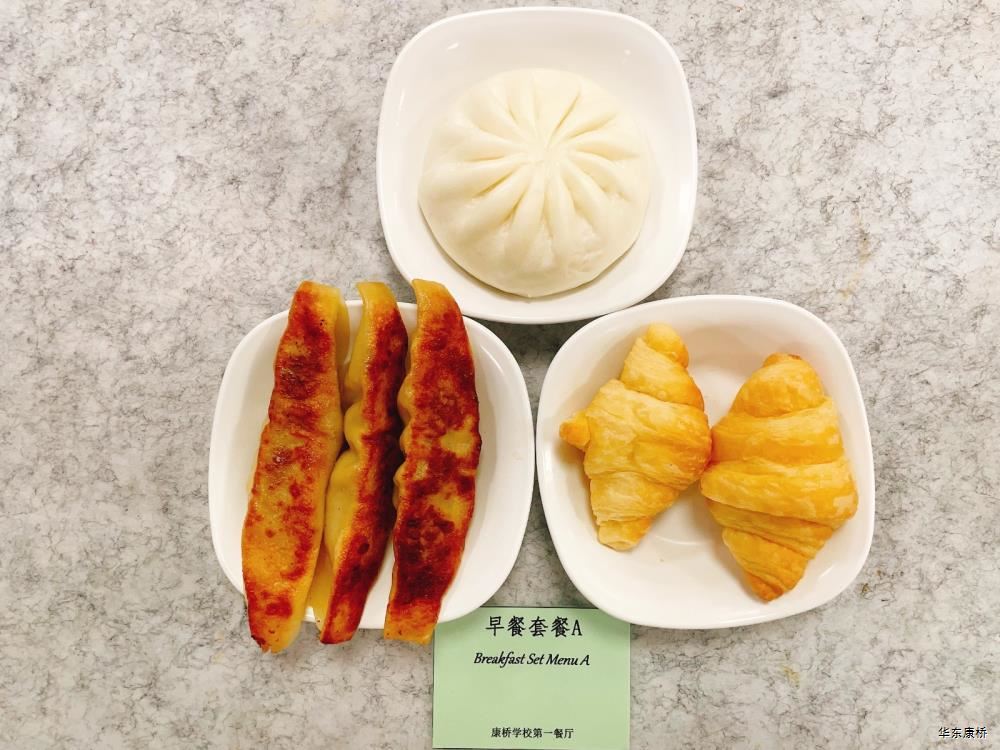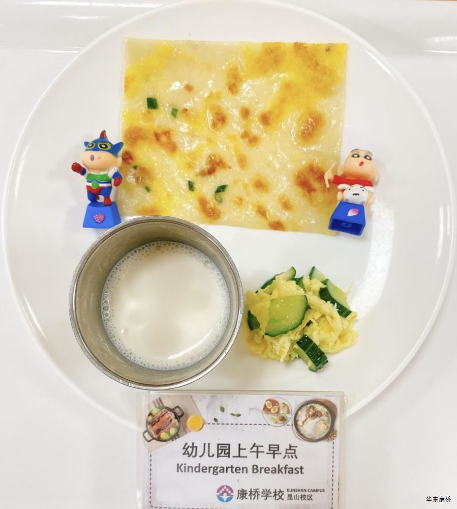 "虎皮蛋Fried boiled egg/荷包蛋Fried egg(二选一) " "海苔肉松甜甜圈Pork floss doughnut/香辣粉丝包(微辣)Spicy vermicelli buns(slightly spicy)/长锅贴*3Pan-fried dumpling (三选二) " "蒸玉米Steamed corn,八宝粥Eight treasure congee,牛奶/阿华田Milk/Ovaltine,白粥Rice Congee,开胃木耳Auricularia appetizer,姜汁藕片Lotus root slices with ginger sauce,青菜肉丝炒面Shredded meat stir fried noodles with vegetables " 韩式泡菜牛肉饭团Kimchi beef rice ball,虎皮蛋Fried boiled egg,纯牛奶/豆奶/早餐奶/酸牛奶(四选一)Milk/Soymilk/Breakfast milk//Sour milk 牛肉蔬菜披萨(140g)Beef and vegetable pizza,虎皮蛋Fried boiled egg,纯牛奶/豆奶/早餐奶/酸牛奶(四选一)Milk/Soymilk/Breakfast milk//Sour milk 炸酱拌面(微辣、小圆面)Fried noodles with meat sauce(Slightly spicy),荷包蛋Fried egg,清炒时蔬Organic vegetables,牛奶/阿华田Milk/Ovaltine
