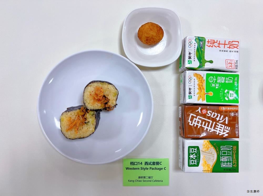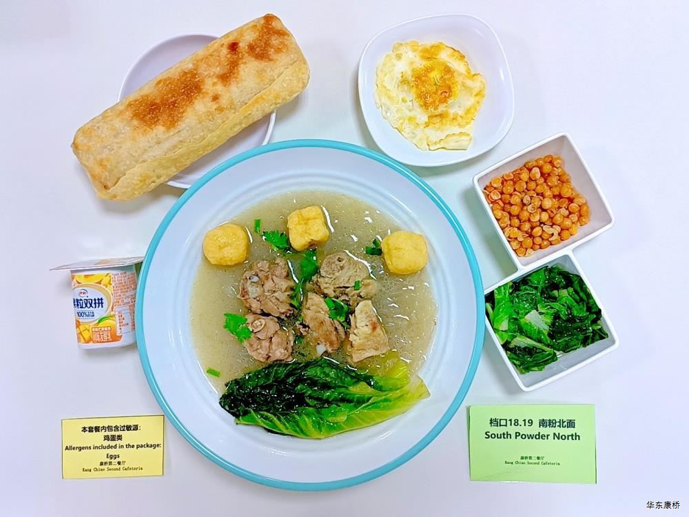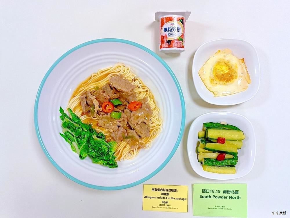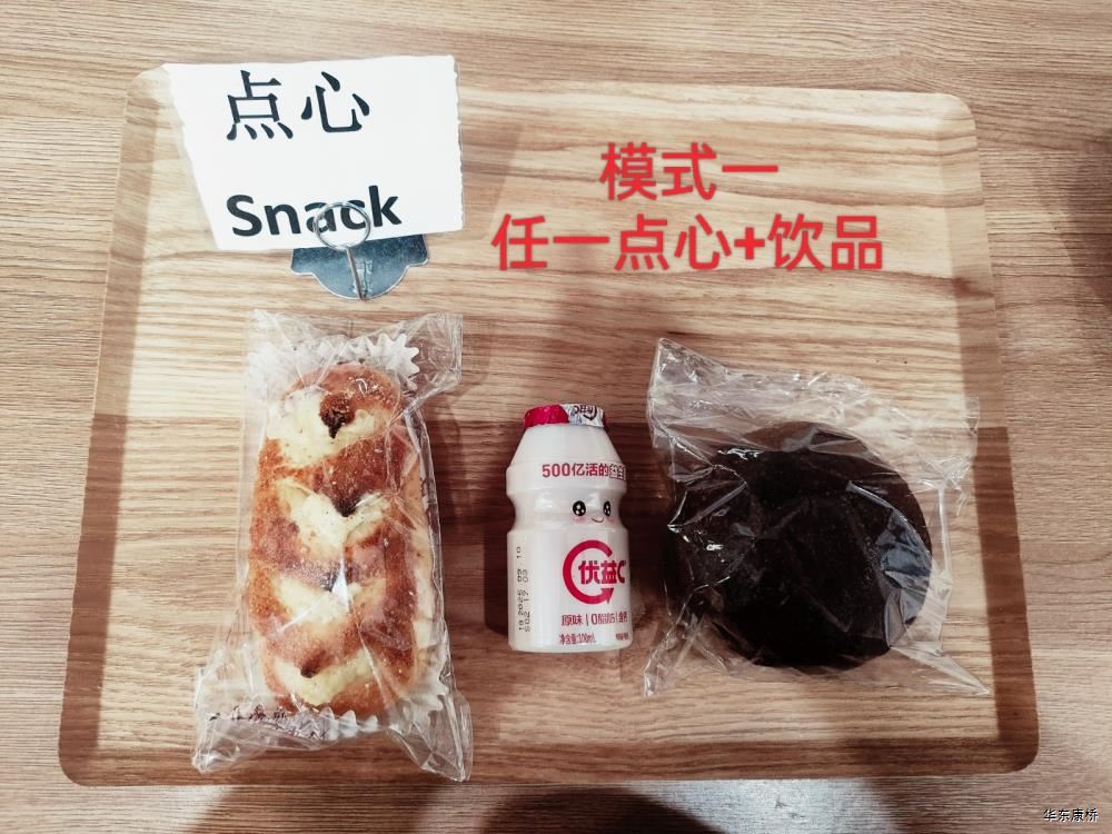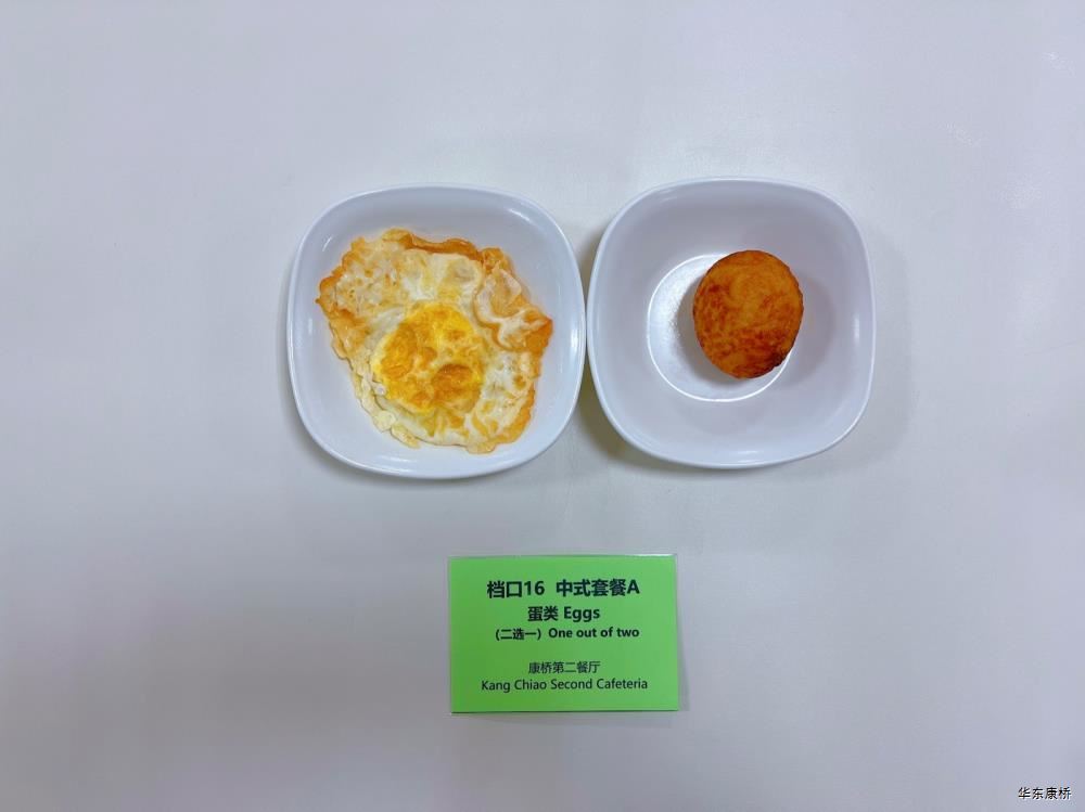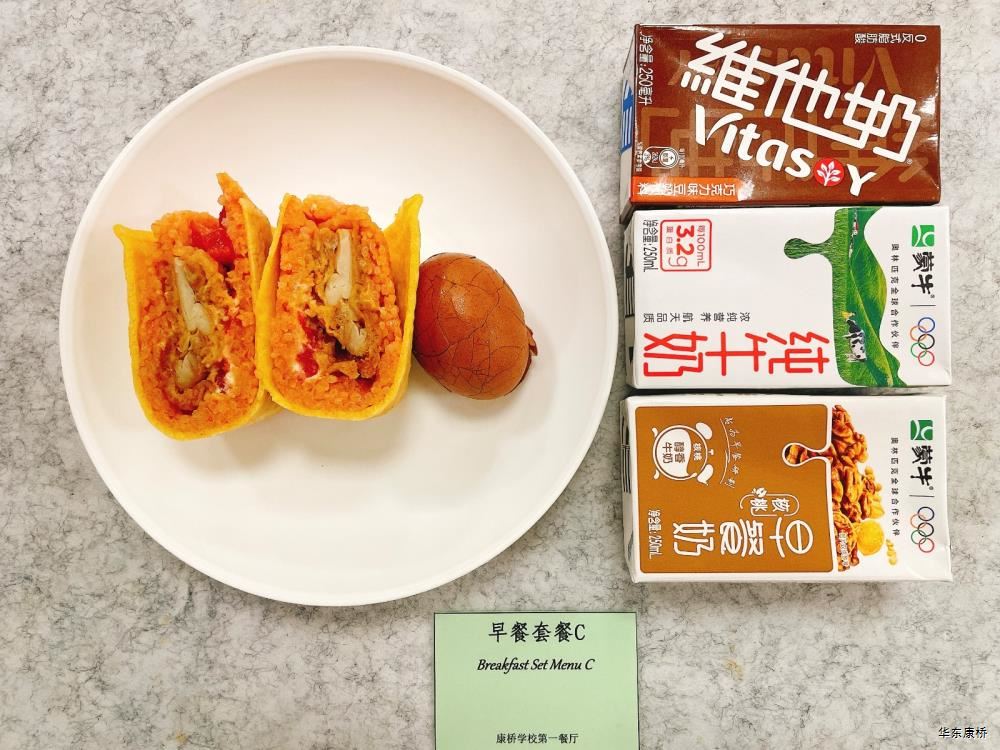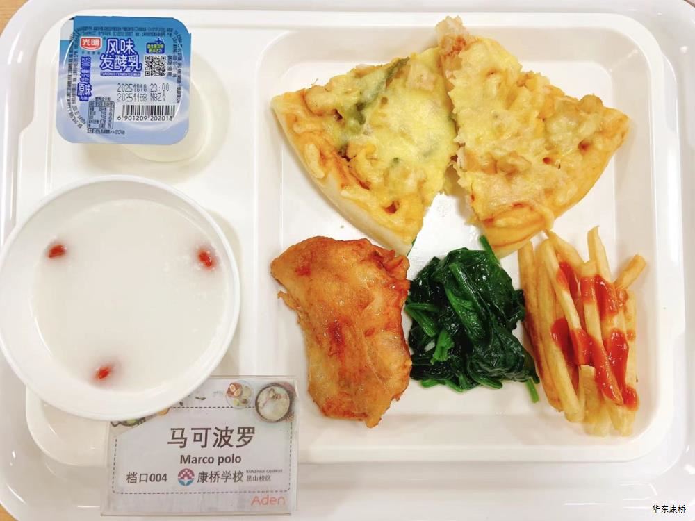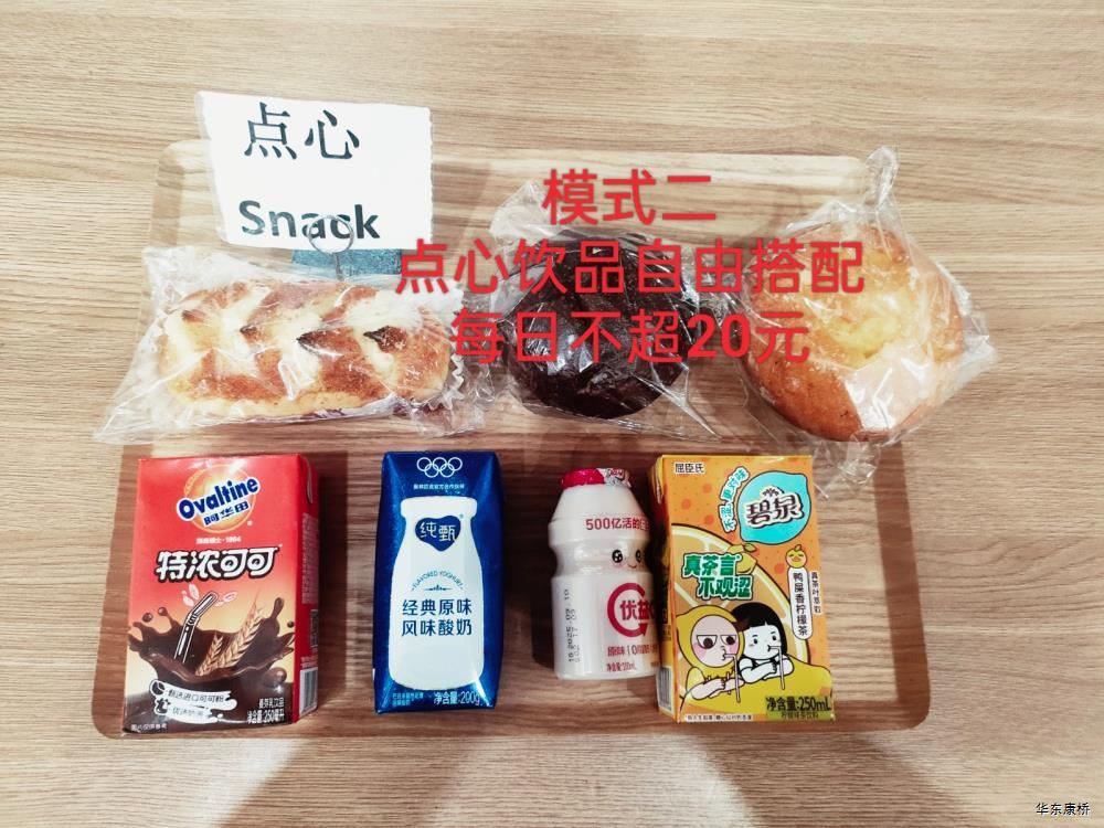 "虎皮蛋Fried boiled egg/荷包蛋Fried egg(二选一) " "海苔肉松甜甜圈Pork floss doughnut/香辣粉丝包(微辣)Spicy vermicelli buns(slightly spicy)/长锅贴*3Pan-fried dumpling (三选二) " "蒸玉米Steamed corn,八宝粥Eight treasure congee,牛奶/阿华田Milk/Ovaltine,白粥Rice Congee,开胃木耳Auricularia appetizer,姜汁藕片Lotus root slices with ginger sauce,青菜肉丝炒面Shredded meat stir fried noodles with vegetables " 韩式泡菜牛肉饭团Kimchi beef rice ball,虎皮蛋Fried boiled egg,纯牛奶/豆奶/早餐奶/酸牛奶(四选一)Milk/Soymilk/Breakfast milk//Sour milk 牛肉蔬菜披萨(140g)Beef and vegetable pizza,虎皮蛋Fried boiled egg,纯牛奶/豆奶/早餐奶/酸牛奶(四选一)Milk/Soymilk/Breakfast milk//Sour milk 炸酱拌面(微辣、小圆面)Fried noodles with meat sauce(Slightly spicy),荷包蛋Fried egg,清炒时蔬Organic vegetables,牛奶/阿华田Milk/Ovaltine
