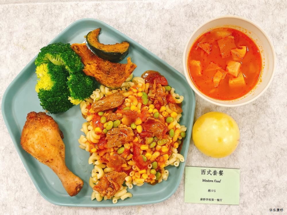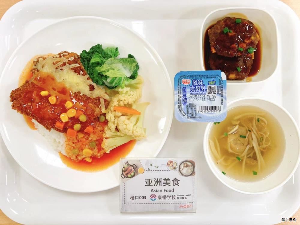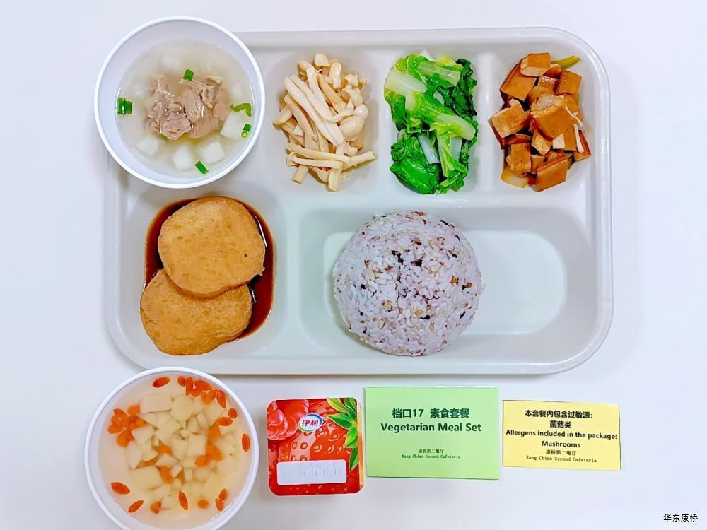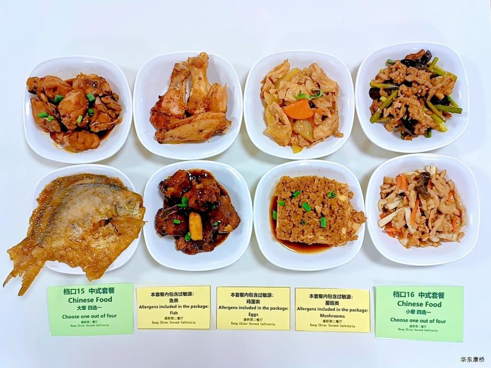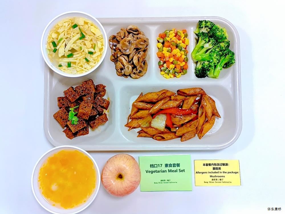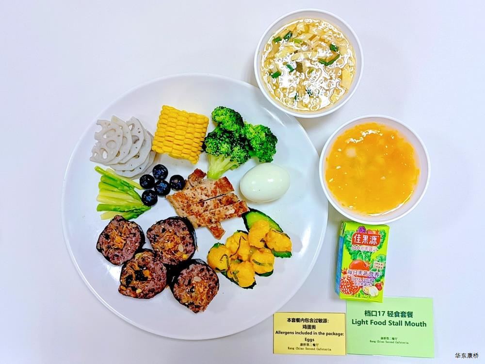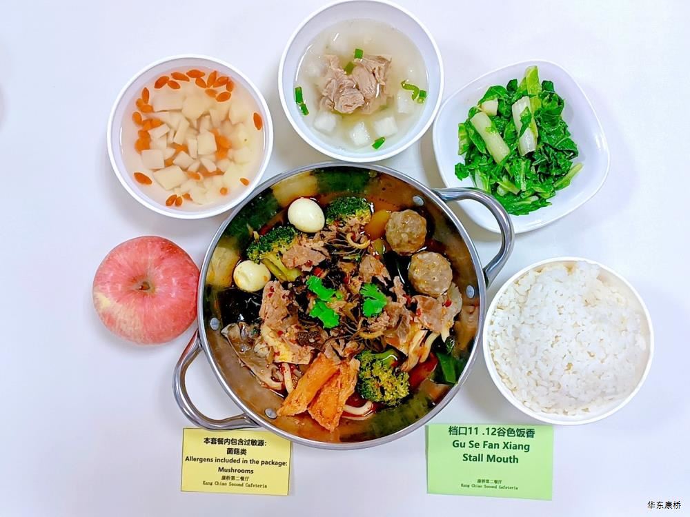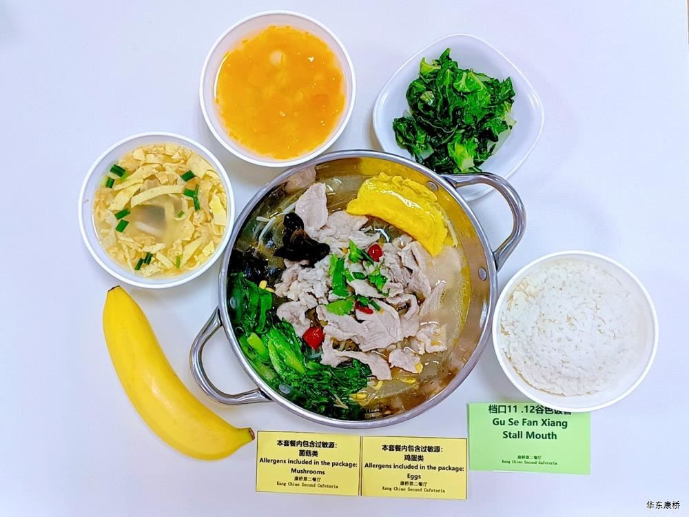"酸汤肉片(微辣)(配料:里脊肉片、蛋饺、黄豆芽、木耳、金针菇(过敏源)、娃娃菜、小青菜、宽粉)Sour soup with sliced pork(Mild Spicy)(Ingredients: sliced pork tenderloin、 egg dumplings、 soybean sprouts、 black fungus、 enoki mushrooms (allergen source)、 baby cabbage、 baby greens、 wide rice noodles), 有机蔬菜一道 Organic vegetables,主食:白米饭Rice,酸奶/水果Yogurt or Fruit,鱼丸三鲜汤Fish balls soup,南瓜小圆子Pumpkin glutinous rice balls " 墨西哥辣椒牛肉炒饭(微辣)(配料:牛肉粒、洋葱、彩椒、番茄)Fried rice with diced beef (slightly spicy)(Ingredients: diced beef、 onion、 bell pepper、 tomato),墨西哥烤鸡块Grilled chicken chunks,蒜香西蓝花Garlic flavored broccoli,有机时蔬一道 Organic vegetables ,酸奶/水果Yogurt or Fruit,鱼丸三鲜汤Fish balls soup,南瓜小圆子Pumpkin glutinous rice balls 大荤(4选1)红烧狮子头Stewed pork ball /葱烧大排Braised pork chop with scallion/脆皮烤鸡Crispy roast chicken/黑椒焗肋排Baked ribs with black pepper,小荤(4选1)蘑菇炒蛋(过敏源)Mushroom scrambled eggs(Allergy source)/西芹鱿鱼花Celery squid flower/回锅肉片Stir-fried boiled pork slices in hot sauce /黑椒杏鲍菇炒鸭丁(过敏源)Diced duck fried with black pepper and shiitake mushrooms(allergen source), 蔬菜:酸辣藕片(微辣) Spicy and sour lotus root slices(slightly spicy),有机蔬菜 Organic vegetables,主食:白米饭Rice,酸奶/水果 Yogurt or Fruit,鱼丸三鲜汤Fish balls soup,南瓜小圆子Pumpkin glutinous rice balls 四喜烤麸Four-flavor fermented soybean cake,金玉满堂Fried diced vegetables,蒜蓉西蓝花Broccoli with Garlic Sauce,黑胡椒香煎口蘑(过敏源)Pan-fried button mushrooms with black pepper(allergen source),炒意面Fried pasta,酸奶/水果Yogurt or Fruit,鱼丸三鲜汤Fish balls soup,南瓜小圆子Pumpkin glutinous rice balls 猪扒拼芥末虾球轻食(配料:猪扒、虾球(过敏源)、杂粮土豆海苔肉松饭团、藕片、西蓝花、玉米段、芦笋、白煮蛋(过敏源)、蓝莓)Pork chop and shrimp balls light food package(Ingredients: pork chop、 shrimp ball(Allergy source)、 miscellaneous grains、 potatoes、 seaweed floss rice balls、 lotus root slices、 broccoli、 corn segments、 asparagus、 boiled eggs(Allergy source)、 blueberries),特殊饮品Special drink,鱼丸三鲜汤Fish balls soup,南瓜小圆子Pumpkin glutinous rice balls 老鸭粉丝汤(配料:鸭肉、荷包蛋(过敏源)、粉丝、小油豆腐、炸豌豆、生菜)Old duck vermicelli soup(Ingredients: duck、 poached eggs、 vermicelli、 bean curd、 fried peas、 lettuce),牛肉馅饼Beef pie, 有机蔬菜一道 Organic vegetables,酸奶/水果Yogurt or Fruit 奥尔良鸡腿堡Orleans chicken leg burger,麦辣鸡块*3Spicy chicken nuggets,波纹薯条French Fries,烤玉米Grilled Corn,蒜泥西蓝花Broccoli,话梅青柠红茶Plum and lime black tea,酸奶/水果Yogurt or Fruit -